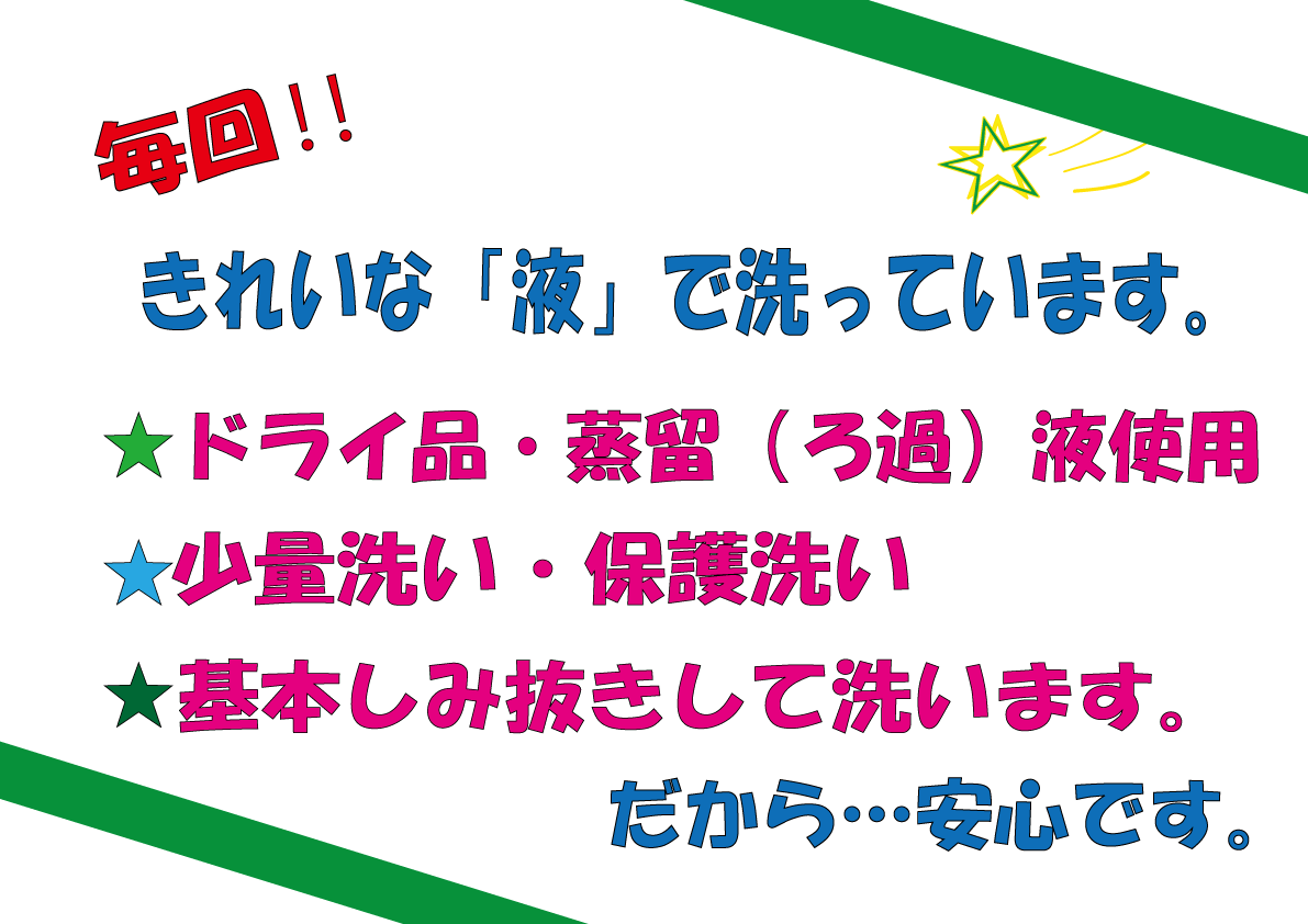 洗濯のプロであるクリーニング店では、汚れやシミを徹底的に落とすための高度な【しみ抜き技術】を保有しています。しかし、しみ抜きの工程では衣類に少なからずダメージが残ります。そこで「通常の洗い」で可能な限りの汚れを落とすことが重要であると私たちは考えます。