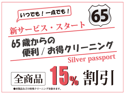 満65歳以上で本サービスをご希望のお客様全員に、全商品(※1)クリーニング料金が15%OFFでご利用いただけるSilver Passport(シルバーパスポート)を発行いたします。廿日市市・広島市全域(※2)集配無料。お客様ご指定の場所まで集荷・集配をご希望の場合でも別料金は発生しません。 ご利用条件:満65歳以上のご本人様からのご依頼(集配時の対面依頼を含む)で Silver Passport(シルバーパスポート)を直接ご提示いただくこと。 |